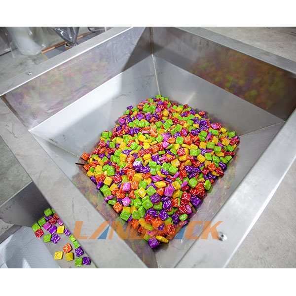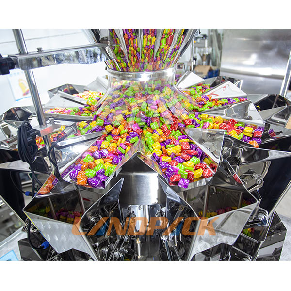 全自動充氮?dú)馊鹗刻枪b機(jī)是一款針對顆粒狀的糖果、塊狀糖果進(jìn)行二次裝袋的機(jī)械設(shè)備,該機(jī)由:Z型上料機(jī)、10頭電子稱、工作支撐平臺、氮?dú)鈾C(jī)、立式包裝機(jī)主機(jī)組成,該機(jī)的工作流程是:操作人員把需要包裝的糖果倒入儲料斗,然后震動儲料斗把糖果輸送到Z型自動上料機(jī)當(dāng)中,Z型上料機(jī)通過輸送帶把糖果輸送到10頭電子稱當(dāng)中進(jìn)行計(jì)量稱重,然后填充到袋子當(dāng)中,灌入氮?dú)?、封口、成品輸出完成整個包裝過程,該機(jī)是全自動化操作,無需人工過多參與。