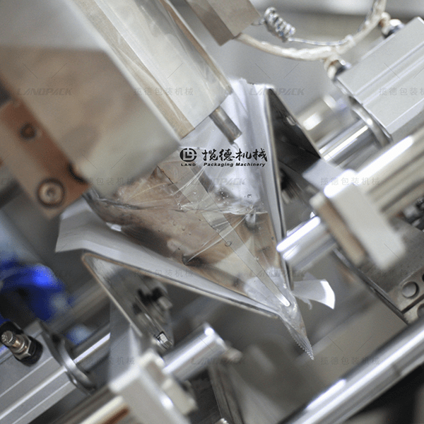 因為是充氣包裝活魚之類的生鮮物料,采用傾斜式倒料機構(gòu),可以有效防止袋子封口裂開,還可以防止活魚在下料過程產(chǎn)生撞擊,保證了存活率。