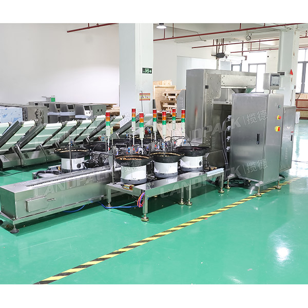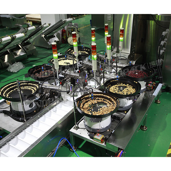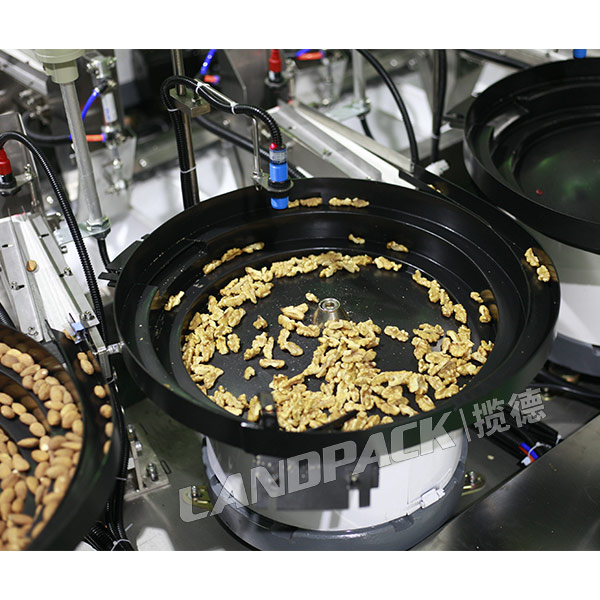 該臺每日堅果包裝機是由水平給袋式包裝機主機、Z型自動上料機、震動盤三大件組成的,該機的工作流程是:操作人員把物料倒入震動盤當中,一袋包裝多少種物料,就配置多少個震動盤,震動盤把物料輸送到傳送帶當中,在通過Z型上料機把物料輸送到袋子當中,然后進行下料,充填、打碼、封口等一系環(huán)節(jié)完成包裝過程。